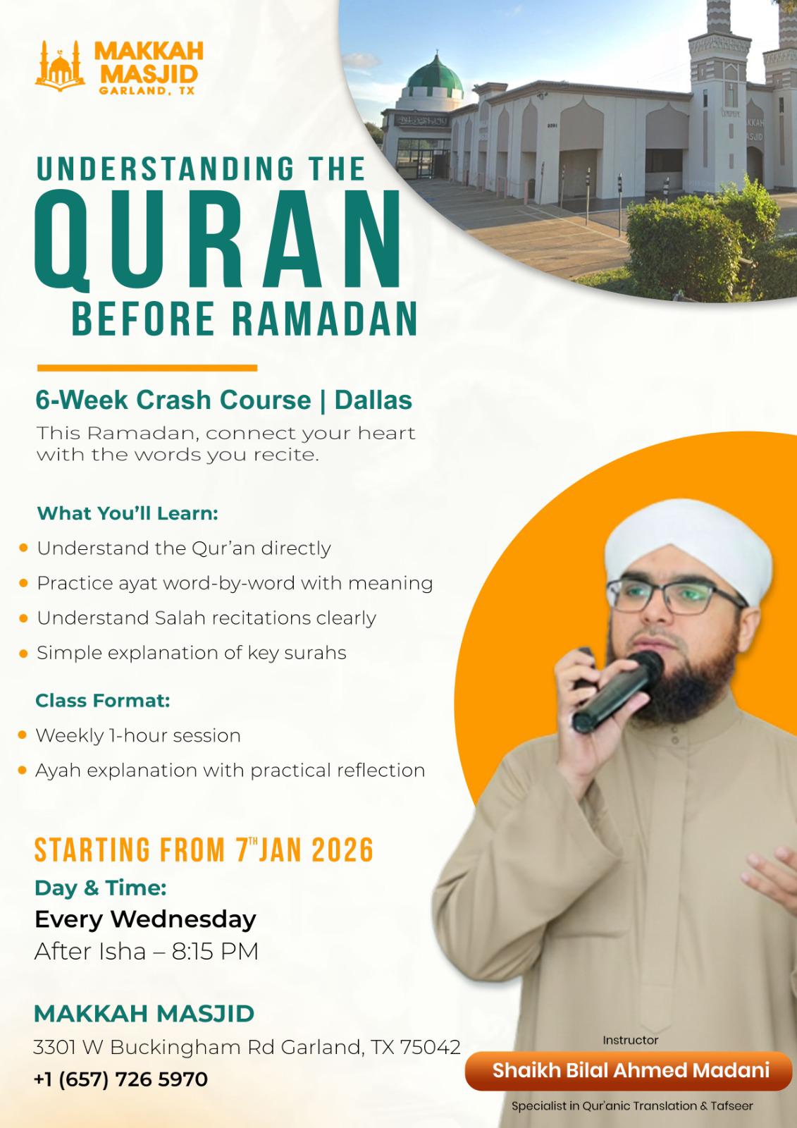 - Title: Understanding the Quran Before Ramadan — 6-Week Crash Course at Makkah Masjid