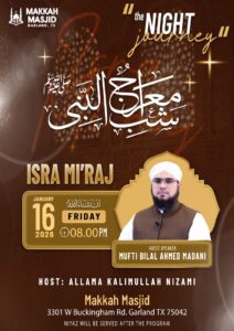 📢 Celebrate the Night Journey with us at Makkah Masjid, Garland. Join Mufti Bilal Ahmed Madani on Friday, January 16 at 8:00 PM for an evening of inspiring reflection, prayer, and community. Niyaz will be served after the program.
