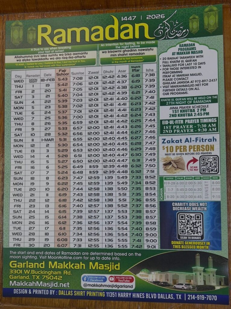 Prayer times as shown on the Garland Makkah Masjid Poster